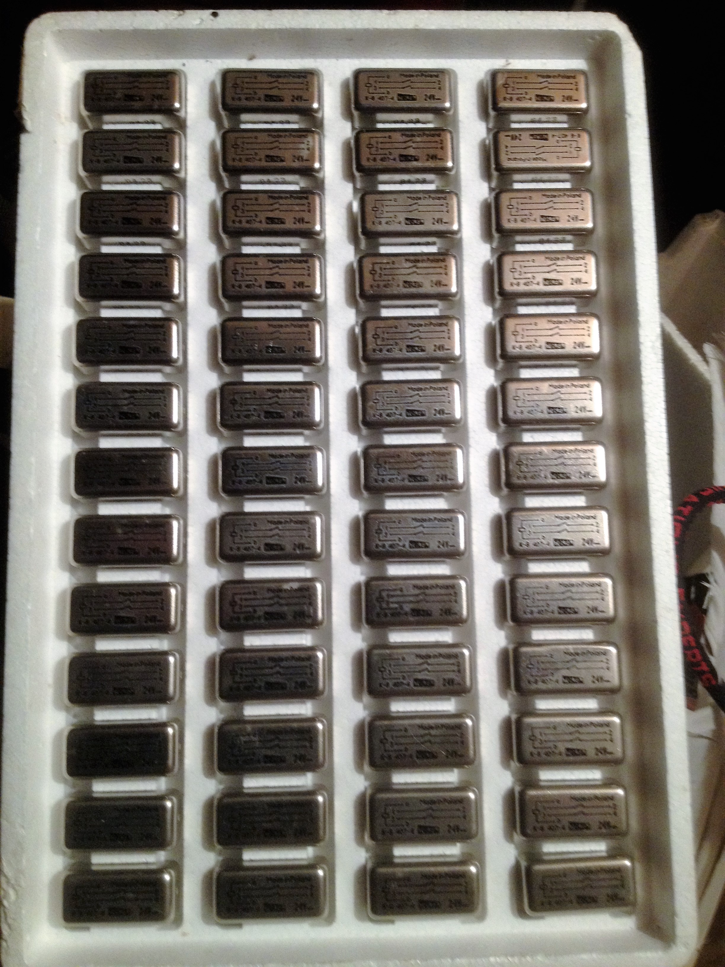 Ilość: 276 2,00 PLN | Dwa rodzaje przekaźników ; k8-409-4-24 Volt=4-pary styków 276 sztuk k8-407-4-24 Volt=2 pary styków 363 sztuki Przekaźniki nowe w opakowaniu fabrycznym | ||||||