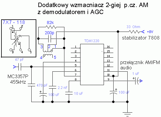 Sygnał 455kHz pobrany jest z pin=5 MC3357/wejście p.cz. poprzez dzielnik pojemnościowy i podany na wejście p.cz. TDA1220.Wymagane elementy do budowy wzmacniacza to dodatkowo filtr 7X7 - 118 i kilka kondensatorów.Pozostałe piny wiszą w powietrzu i należy szczególnie uważać przy pomiarach ,bo są delikatne i jedną kostkę posłałem w kosmos.Ewentualnie należy dobrać wartości dzielnika pojemnościowego ,ponieważ różne modele są inaczej zestrojone a TDA posiada bardzo silny wzmacniacz p.cz.