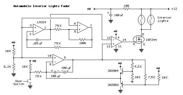 Kiedy zamkniesz drzwi swojego samochodu wewnętrzne oświetlenie gaśnie natychmiast, przygasa lub pozostaje stale włączone, a Ty zastanawiasz się, czy drzwi są domknięte. Poniższe urządzenie pozwoli Ci kontrolować wewnętrzne oświetlenie. Będziesz mógł również zaprogramować czas przygasania. Obwód poniższego urządzenia jest przeznaczony dla starszych samochodów posiadających przełącznik zamontowany w drzwiach zapewniający masę dla wewnętrznego oświetlenia z jedną stroną oświetlenia podłączoną do plusa baterii poprzez bezpiecznik. Po niewielkich modyfikacjach urządzenie może również zostać przystosowane do samochodów nie posiadających przełącznika w drzwiach.