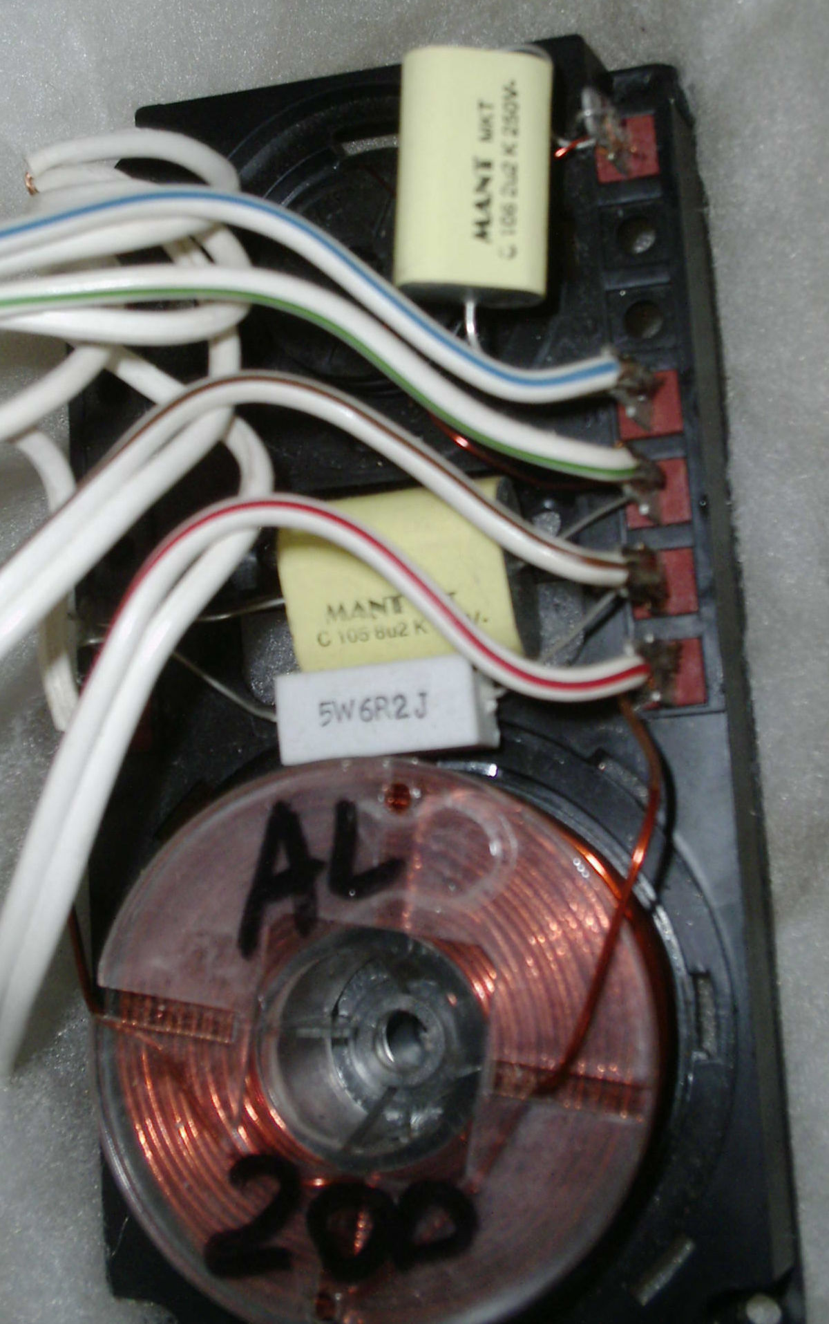 rozebrałem kolumny i okazało sie że zwrotnice sie od siebie różnią. ! nie wiem jak to możliwe. kolumna która gra poprawnie wg. mnie ma przed głośnikiem średniotonowym wlutowane dwa "kondensatory" MANT MKT c106 na napięcia 250v o oznaczeniach jeden 4u7 i drugi 2u2. do tego jeszcze dochodzi rezystor 5W4R7J. kondensator od wysokotonowego jest taki sam w obu zwrotnicach. w zwrotnicy która gra gorzej w miejsce rezystora 5w4r7j znajduje sie rezystor 5W6R2J. a w miejsce 2 kondensatorów c106 znajduje sie jeden o oznaczeniu c105 8u2 k160V. i ta kolumna właśnie gra gorzej od tamtej. załanczam zdjęcie zwrotnicy któa gra gorzej. jak to powinno być zrobione żeby grało tak jak trzeba? co najlepiej wymienić ?
