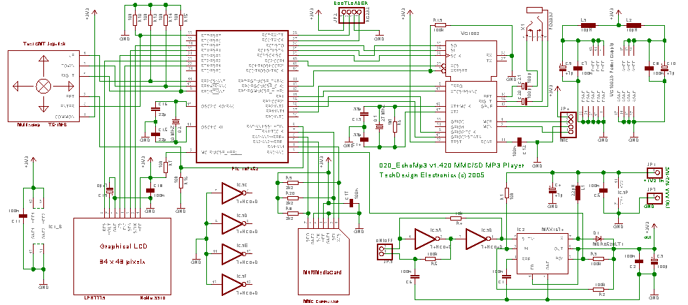Całość zbudowana na PIC18LF452 z dekoderem mp3 VS1001K. Szczegóły a stronie projektu.