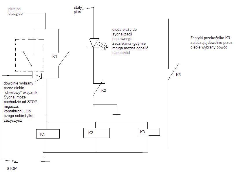 Potrzebuje zrobic odcięcie z pamięcią. Chodzi o to zeby podac impuls np ze STOP(+) i z guzika chwilowego (-) na przekaźnik. Nie wiem jak to zrobic aby przekaźnik "trzymal" do momentu wyłaczenia zapłonu. Wiem ze kiedys kumpel robil to na 3 przekaznikach a ja sie natyle nieznam aby to rozgryzc.