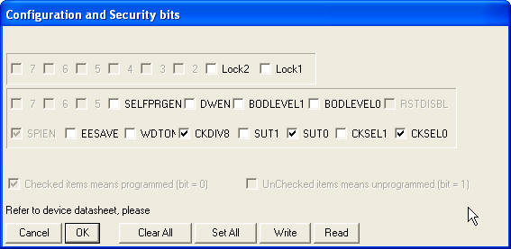 Uruchomiłem "tęczowy kryształ" z EdW 11/2004 i nie umiem ustawić fusów na zewnętrzny oscylator. Przy wewnętrznym występuje migotanie diody (za mała częstotliwość.