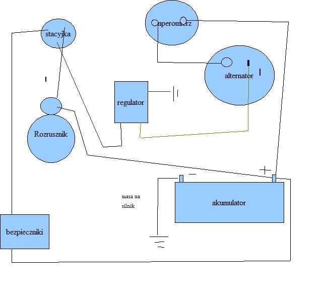 Witam wszystikch mam takie pytanko, jestem właścicielem łodzi rybackiej potrzebuję wymienic w niej alternator. Obecnie przy silniku od C-385 pracuje alternator od stara ale od samego początku mam problemy z ładowaniem myślę że jest to wina źle poprowadzonej instalacji (zamieszczam schemat który zrobiłem w biegu). [img]