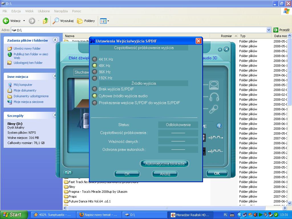 #1 5305336 02 Lip 2008 13:33 TOMEEK88 TOMEEK88 Poziom 9 #1 5305336 02 Lip 2008 13:33 Witam mam pytanie otóż mam amplituner Harmana Kardona avr235 połączonego z karta dźwiękową za pomocą kabla coaxial i nie wiem jakie ustawienia zastosować w karcie i amplitunerze.NA screenie są przedstawione ustawienia.