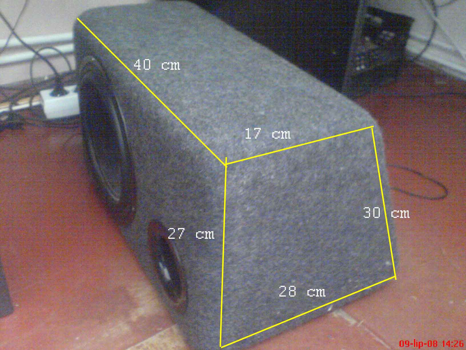 Jednak sub ten, który mojemu koledze wystarczał w zupełności, mi w ogóle nie odpowiada, niemiłosiernie buczy. Po zatkaniu otworu BR jest dużo lepiej. "Na moje ucho" z zatkanym BR-em na pewno poprawia się impuls (z otwartym BR-em stopka w szybszych utworach zlewała się w jedno wielkie buczenie...), możliwe że nawet schodzi niżej. Z tego co mówił mi kolega sub nie był wcale strojony, kolega włożył pierwszy lepszy BR ze sklepu, obudowa też nie była liczona. I tu pojawia się moje pierwsze pytanie- jak mogę dostroić BR do odpowiedniej długości. Teraz BR ma 8cm średnicy i 10 cm długości. Wymiary budy na zdjęciu.