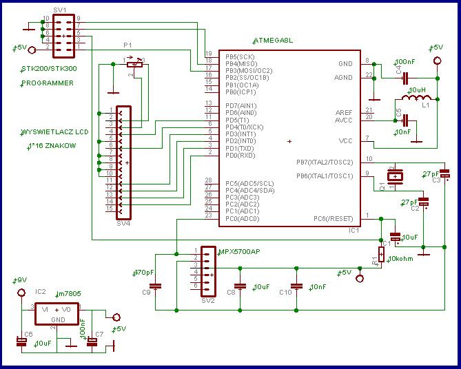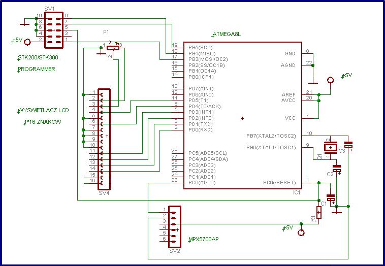 W moim projekcie używam Atmegi8L do przetwarzania napięcia przesłanego z czujnika ciśnienia (MPX5700AP) i do wyświetlenia tej wartości na wyświetlaczu LCD. Jednak otrzymane wyniki sz bardzo rozbieżne i na pewno nieprzystające do rzeczywistości... (wyświetla od 30 do 70kPa)