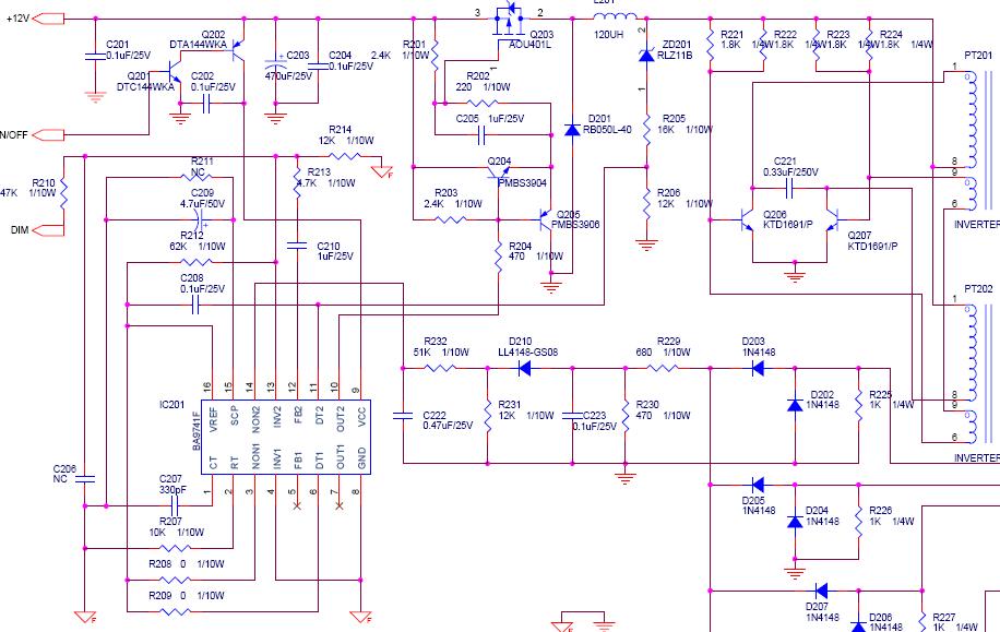 Przywieziony z Niemiec bez zewnętrznego zasilacza 12V 3A. Po podaniu zasilania dioda power zaświeca się w kolorze zielonym na ok. 3 sek, po czym gaśnie na ok. 1 sek., ponownie zaświeca się na 3 sek., gaśnie i tak w kółko. Choćby na ułamek sekundy nie startuje podświetlenie matrycy. Układy na płycie głównej to : MRT MASCOT V CH0463.00 0243, Winbond M78E62BP-40, eeprom 24LC16B smd. Przyłączony do karty graficznej czy też nie, monitor zachowuje się identycznie. Na złączu inwertera obecne jest nap. zasilające +12V oraz masa. Nie zmienia się stan na pinie on/off inwertera. Tutaj jest 0V. Inwerter zbudowany jest na BA9741, 9435A oraz dwóch tranz. smd . Zasilanie inwertera poprzez bezp. 2A dociera do 1,2,3 nogi 9435A . Na 8 nodze 24lc16 jest 3,3V. Na 5 i 6 nodze 24lc16 nap. zmienia cyklicznie wartość z 1,2V na ok. 3V. Monitor z wylutowaną 24lc16 jak i wypiętym inwerterem, zachowuje się bez zmian. Czego się czepić ?. Czyżby oprogramowanie w M78E62BP ?.