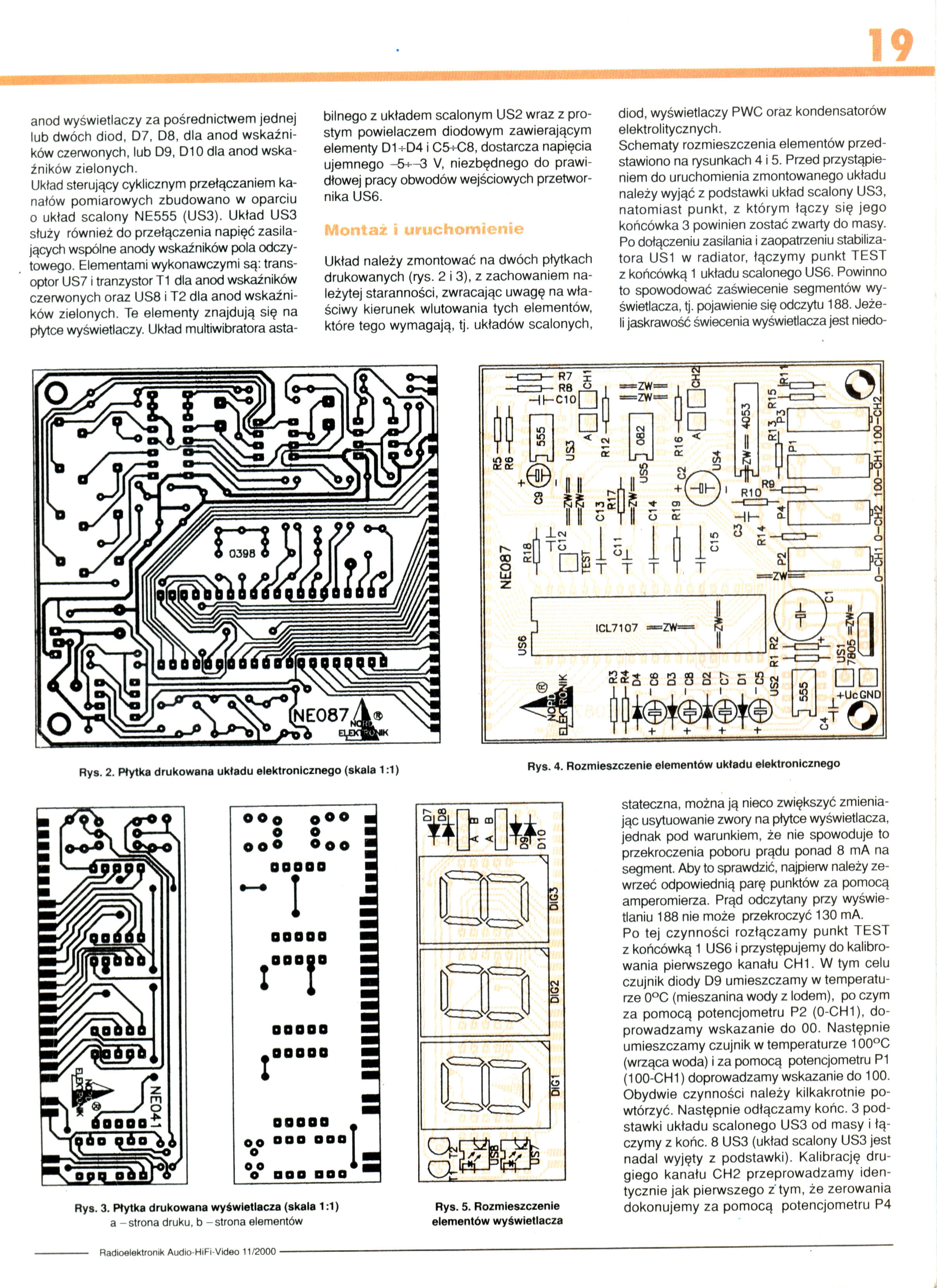 Pragne zamieścić na forum elektrody ten oto projekt "Podwójnego Termometru Cyfrowego". Projek ten, to termometr cyfrowy, z dwupunktowym pomiarem temperatury, oraz wyświetlaczem zrobionym na dwukolorowych (czerwony/zielony) kostkach LED. Schemat + opis tego urządzenia to skany z gazety Radioelektronik 11/2000, natomiast cały termometr jest dostępny jako kit Nord Elektronik NE087 na stronie producenta - http://www.nordelektronik.pl/ne/ne087.htm . Wykonanie projektu nie powinno sprawić większych trudności, jedynie przy montowaniu układu przez mojego kolege był kłopot z dostaniem transoptora SFH601 oraz samych wyświetlaczy. Ogólny koszt wykonania projektu wg schematu wyniósł ok 80-90 zł (cena kitu na dzień dzisiejszy nie przekracza 60 zł).
