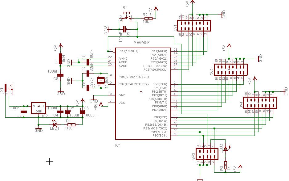 Chcę się nauczyć programowania mikrokontrolerów z rodziny AVR w języku C, a wiadomo że najlepiej nauczyć się tego w praktyce dlatego postanowiłem zrobić płytkę testową z ATmegą 8, jako że moje zdolności elektroniczne są na mizernym poziomie dlatego skompilowałem pare schematów takich płytek w jedną całość i chciałbym aby ktoś sprawdził mój schemat.