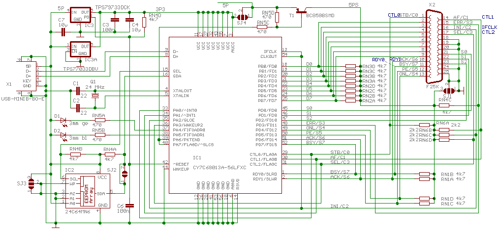 Znalazłem schemacik...jest to ten adapter...ten drogi do SmartClipa, ukłąd cy7c68013a-56lfxc jest ogólnodostępny, EEPROM również...pytanko, czy wie ktoś może jaka zawartość EEPROM ma być? Bo cy7c68013a-56lfxc programuje się automatycznie z eeprom, więc jeden problem mniej