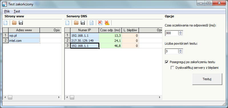 1. W lewym oknie należy wpisać wybrane przez siebie (dowolne) adresy www. Należy przy tym pamiętać, aby nie wpisywać błędnych (nie istniejących) adresów, gdyż nawet prawidłowo działający DNS zwróci w takim przypadku błąd.