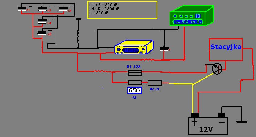 Niedawno kupiłem nowe radyjko, w miarę dobre mi się wydaje i aby dać mu trochę mocy (czy nie mówiłem, że elektryka jest grzebana i kabelki są jak z chińskiej - o przepraszam - włoskiej zabaweczki) zaprojektowałem taki układzik.