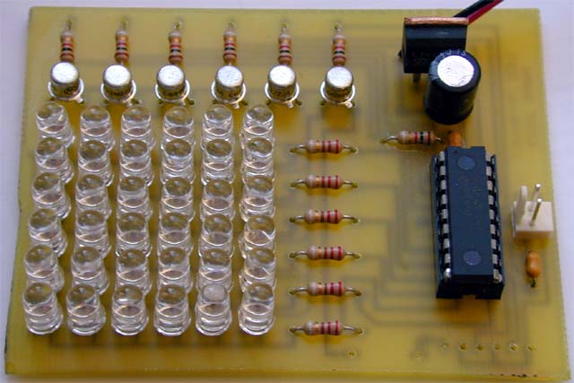 Jest to świetny projekt pozwalający na zapoznanie się z programowaniem mikrokontrolerów PIC. Mała matryca LED pozwoli na tworzenie pierwszych prostych programów i zapewni odrobinę zabawy. Cały projekt składa się z łatwo dostępnych i stosunkowo tanich elementów. Sercem układu jest mikrokontroler PIC 16F28. Początkujący elektronicy musza zwrócić uwagę na za stosowanie właściwego typu tranzystorów. Kilka wskazówek wraz ze schematami i wzorami płytki znajdują się na stronie projektu.