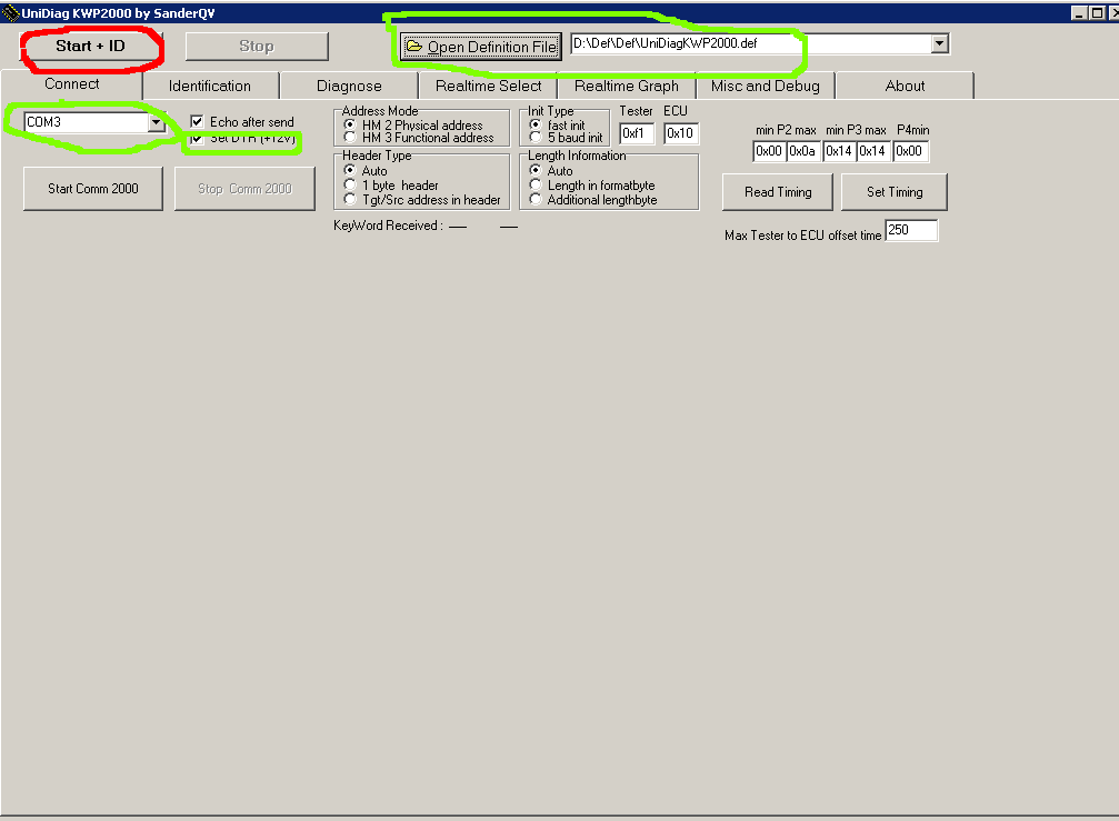 Trzeba zaznaczyć definicje dla twojego ECU --oprócz programu musisz miec folder def zapisany na dysku z niego podajesz definicje u mnie działało z KWP200.def a teoretycznie powinno działać z innym plikiem alfa fiat jtd-ale nie łączył się.
