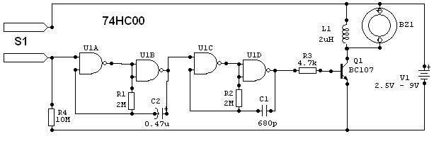 Jak nazwa wskazuje, uslyszymy przenikliwy dzwiek ostrzegawczy gdy woda dojdzie do czujnika S1 i zalaczy obwod multiwibratorow. Wtedy zwykly piszczek piezo ( moze byc taki z zegarka ) zacznie wyc informujac nas o napelnienu wanny do wymaganego poziomu. Poki styki S1 nie sa zwierane przez wode uklad pobiera ok 2 mikroAmperow pradu, a wiec w ogole nie wymaga wylacznika. W stanie aktywnym ( brzeczenie ) uklad pobiera ok 7mA. Zasilany moze byc napieciem od 2.5V do 14V. Typ tranzystora NPN moze byc dowolny, byle prady zerowe nie byly duze.