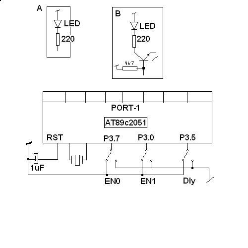 Jesli P3.7 = 1, to P3.0 = 0 zezwala na dzialanie ukladu, a jesli P3.7 = 0, to P3.0 = 1 zezwala na dzialanie ukladu. Do tego dodajemy kondzior do resetu i kwarc 24MHz, i mamy gotowy uklad weza swietlnego na procesorze 89c2051.