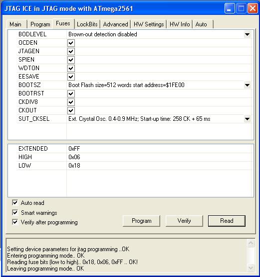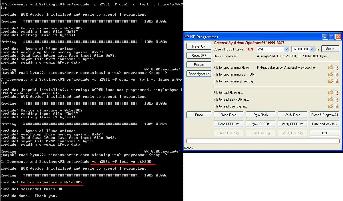 Mam problem z połączeniem się z ATmegą 2561. Wcześniej wszystko chodziło dobrze do czasu aż wgrałem poprzez avr studio program do obsługi USART0. Użyłem do tego programatora USBisp z wgranym STK500v2. Nie ustawiałem żadnych Fusebitów (domyślne AVR Studio). Teraz nie mogę się połączyć z nim w żaden sposób. Próbowałem również przez ISPProg i STK200. W żaden sposób nie mogę uzyskać sygnatury M2561.