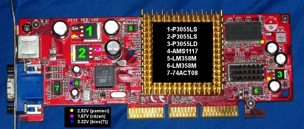 Nie znalazłem nigdzie do niej opisu vmoda więc sam próbuje coś wymyślić ale mam problem bo jest na niej tylko jeden stabilizator i to raczej na pewno do zasilania biosu bo jest słabiutki (800ma) i na wyjściu ma 3.3V (rdzeń w tej grafie jest na 1.6V a pamięci 2,5V). Oprócz niego są tranzystory które na pewno zasilają pamięci i rdzeń ale nie wiem co nimi steruje :? . Zastanawia mnie też po co te dwa wzmacniacze operacyjne. po ścieżkach wiele nie widać, w ogóle nie wiem jak to działa
