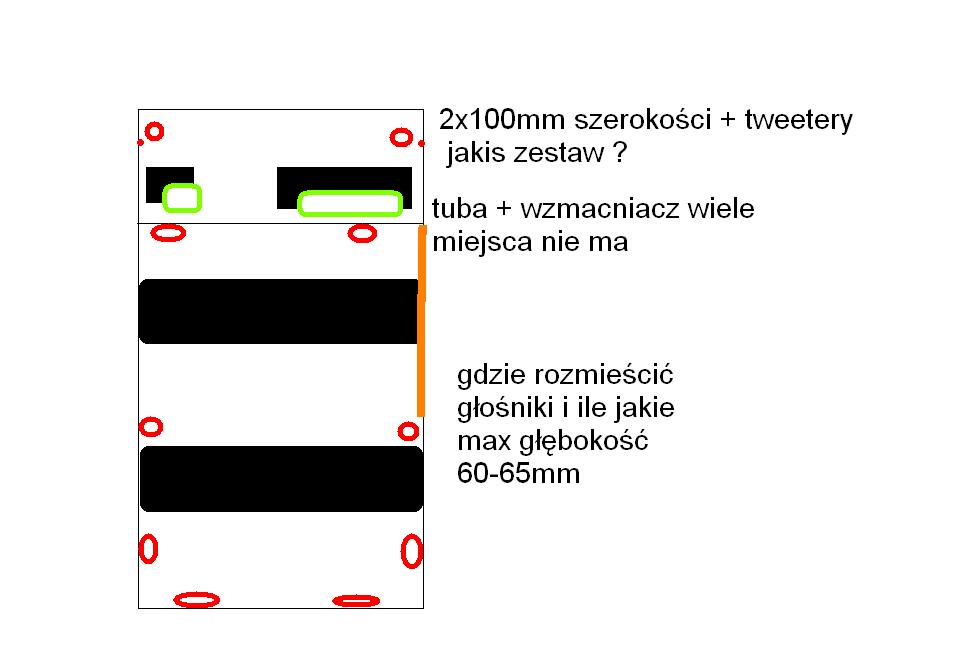Tył-???? otwory zrobię średnica obojętnie ale głębokość głośnika nie większa niż 60 mm 65mm nie mogą wystawać gdyż często worze towary i po prostu by przeszkadzały jako ze jest to bus to wejdzie tam wiele głośników i teraz mam pytanie czy lepiej inwestować w 4 głośniki + tuba wzmacniacz czy np. 6 głośników + tuba wzmacniacz co będzie lepiej grało czyściej przyjemniej każdy rodzaj muzyki