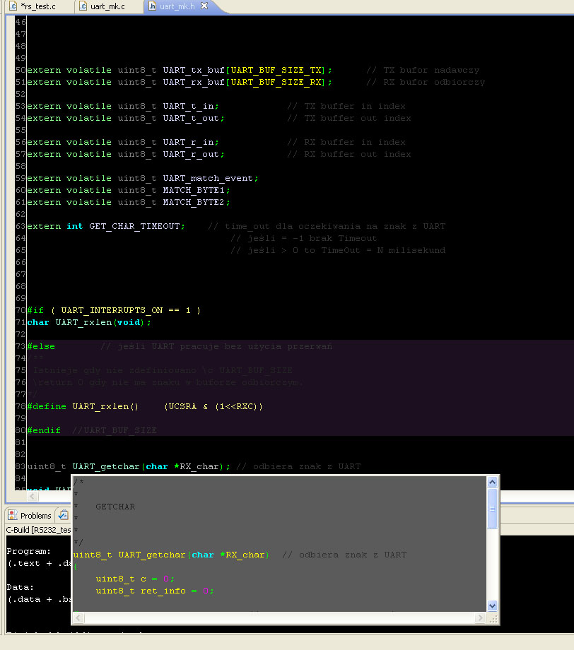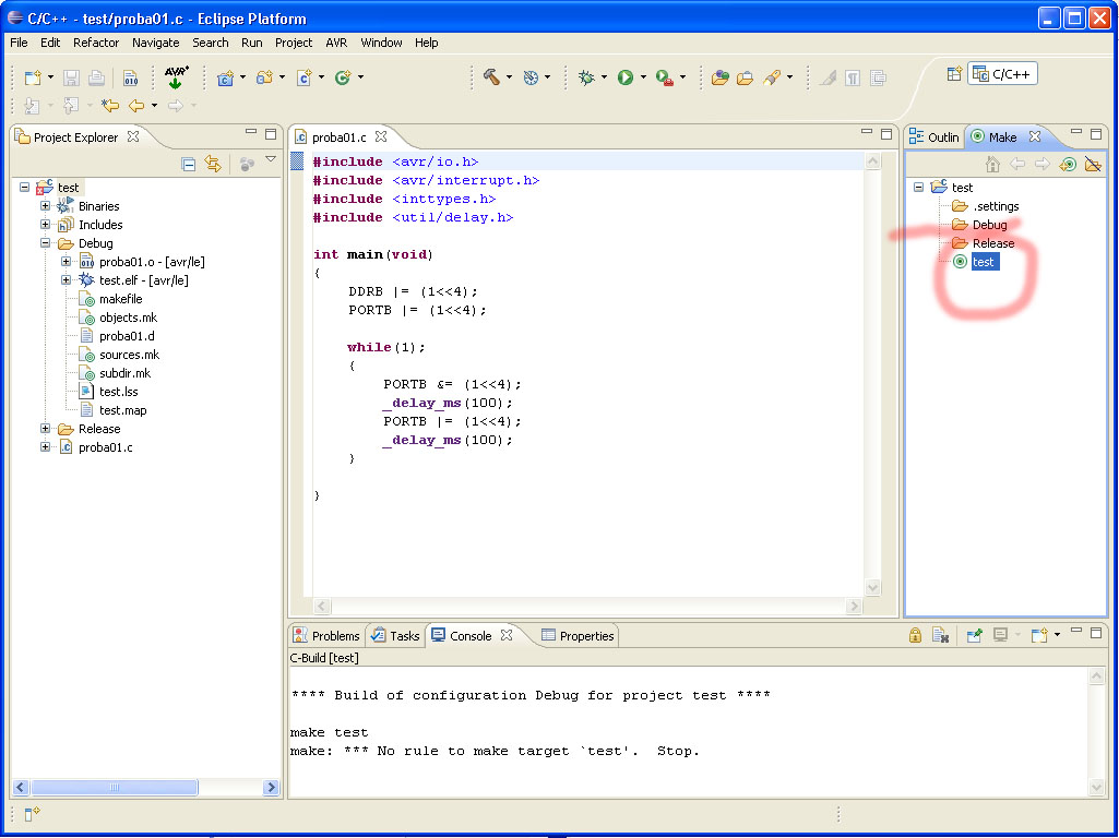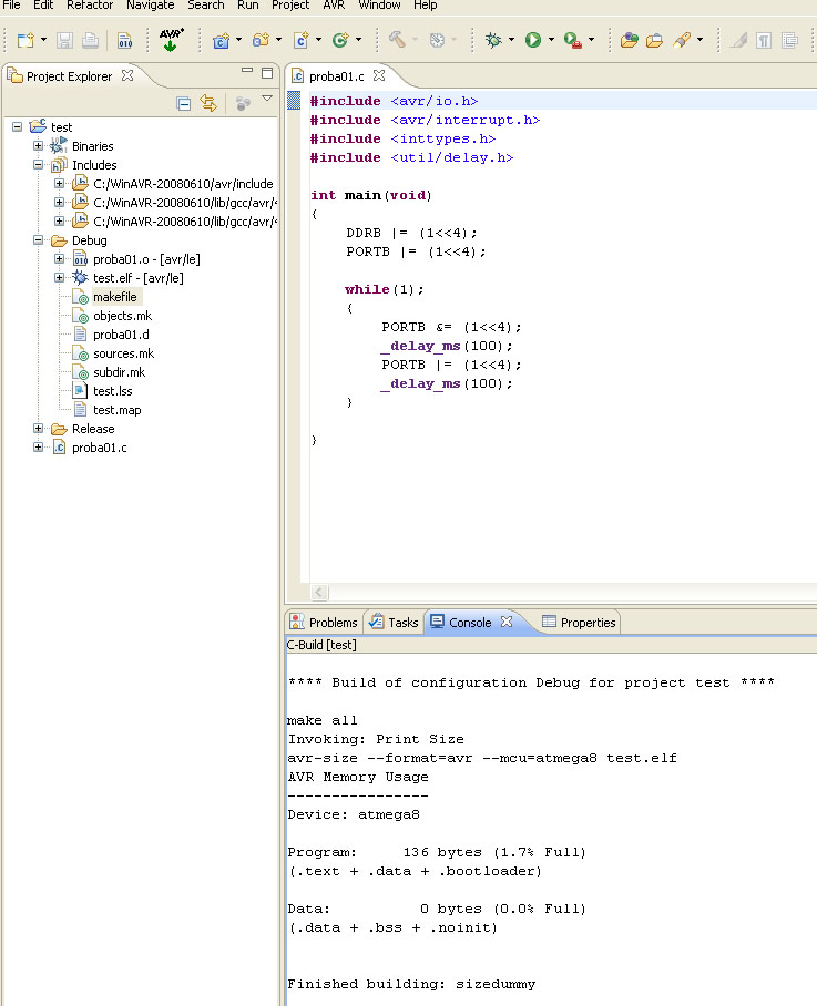 ładnie już mi się udało prawie wszystko uruchomić, tzn stworzyć jakiś przykładowy projekt, tylko z kompilacją mam problem. Tzn kompiluje się wszystko tylko nie powstaje plik HEX, po drodze gdzieś w gąszczu milionów opcji (trochę tego za wiele jak dla mnie na początek w eclipse) pojawia się jakiś parametr "dummysize" coś czuję że związane to jest z tym, że źle zdefiniowałem jakiś Target - chociaż nie wiem z "czym się je" ten target. Z prawej strony w okienku coś tam stworzyłem ale poddaję się - nie mogę ruszyć dalej. Widać jak mówiłem , że jakaś kompilacja się odbywa, tylko HEX nie powstaje, a na końcu z opcji wynika że jeszcze można ładnie avrdude odpalić i zaprogramować procka wprost z eclipse.