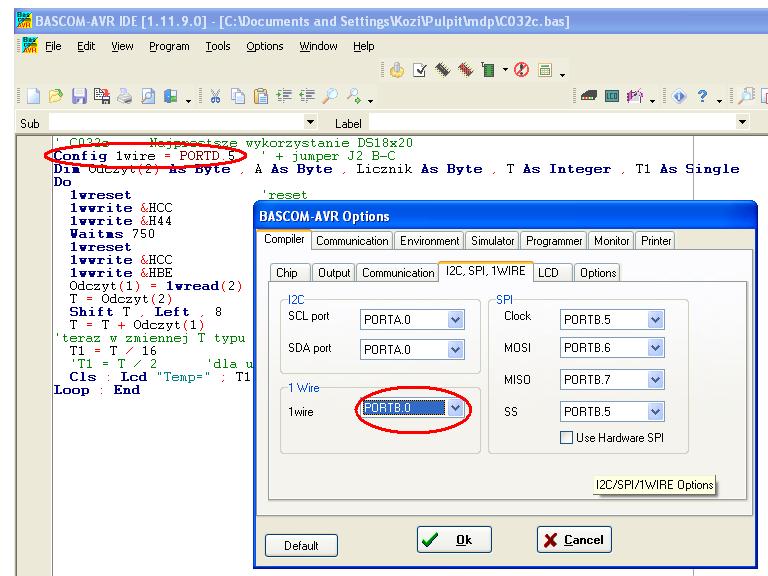 Wiem że problem był wałkowany setki razy,ale jakoś nie mogę sobie z nim poradzić. Posiadam zestaw uruchomieniowy zvl11 na którym to prowadzę kurs oślej łączki. Wrzuciłem wsad podany niżej do uP i odczyt z ds18b20 jaki otrzymuje to "Temp= -0.0625oC" i pod wpływem ogrzewania nic się nie zminia. W zwiazku z tym mam kilka pytań. Mianowicie czy w ustawieniach bascomu options>progarammer>compiler>1wire musi być ustawiony port komunikacji ten sam który definiujemy w programie? Czy mogą być one różne? W książce niema żadnej wzmianki o tym. Czujnik mam podłączony, przez 3 końcówki to jest ,gnd, Vcc oraz data, i z daty do Vcc przez rezystor 3.3K. JAkaś komunikacja z układem jest ponieważ gdy wypnę date z pinb.0 to LCD pokazuje "Temp=0.0oC" Czy czujnik jest walnięty czy poprostu przed 1 użyciem trzeba go jakoś skonfigurować? A może błąd w kodzie programu?