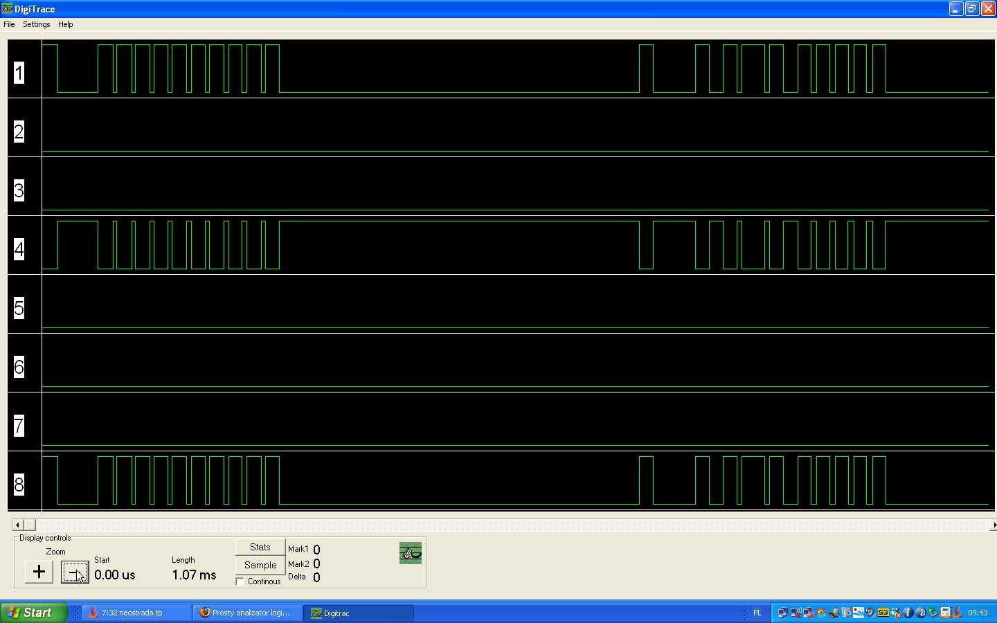 Analizator logiczny to bardzo przydatne urządzenie gdy pracujemy z układami cyfrowymi. Obecnie na rynku raczej brak takich narzędzi do użytku domowego w rozsądnej cenie. Prezentowany analizator posiada 4 wejścia cyfrowe. Częstotliwość próbkowania zależna jest od dołączonego rezonatora kwarcowego (max 4MS/s dla kwarcu 16Mhz). Stany logiczne zapamiętywane są w mikroprocesorze, a następnie przesyłane do komputera PC za pomocą zwykłego portu szeregowego. Autor maksymalnie ograniczył ilość elementów użytych do tego projektu. Ze względu na fakt, że port szeregowy w 99% PC-tów rozpoznaje prawidłowo stany logczne TTL, zamiast popularnego MAX232, autor użył tylko negatora. Obecna wersja oprogramowania umożliwia przegląd uzyskanych przebiegów, pomiar wypełnienia oraz częstotliwości. W planach ma powstać analizator protokołów oraz możliwość zapisu przebiegów.
