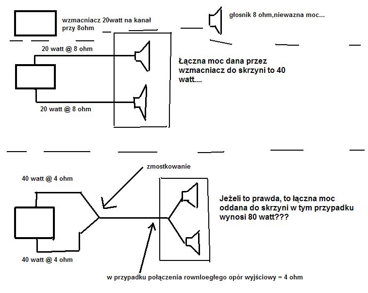 Witam. Planuję zrobić skrzynię z dwoma głośnikami. w związku z tym od wczoraj trapi mnie taki problem, czy jest tak jak sądzę, że mając ten sam wzmacniacz można w zależności od sposobu podłączenia otrzymać dwukrotnie więcej mocy? Schemat mej teorii w załączniku. Mi się wydaje słuszna, aczkolwiek jakoś na zdrowy rozsądek ciężko w to uwierzyć... Proszę, powiedzcie czy będzie tak jak narysowałem, czy jestem w błędzie...