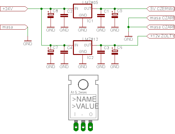 Jeżeli będzie się bardzo to grzało, należy włączyć w szereg z napięciem 24V wchodzącym do stabilizatorów, żarówkę np. 12V/5W wstępnie zmniejszając napięcie wejściowe do stabilizatorów