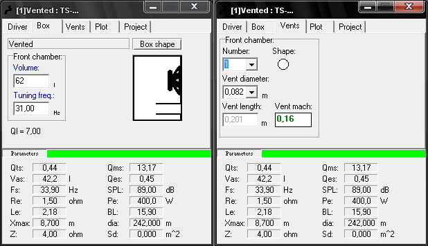 Producent zaleca obudowe zamkniętą 24 - 49,6 l, co moim zdaniem jest nieporozumieniem. Zobaczcie na moje wyliczenia i prosze o Waszą opinię na ten temat, dlaczego taka cienka charakterystyka wychodzi dla polecanej przez producenta obudowy, a dla obudowy BASS-REFLEX wrecz modelowa.
