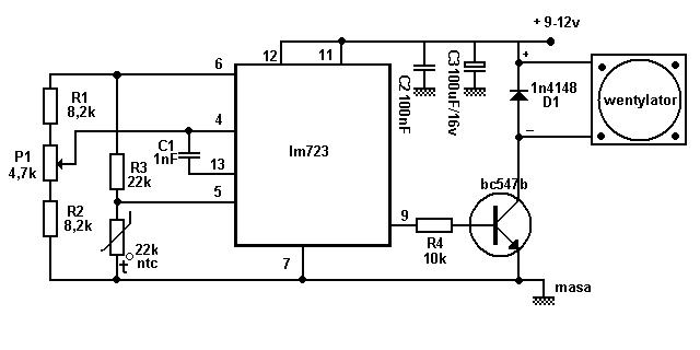 Układ został zbudowany w oparciu o lm723 .Wraz ze wzrostem temperatury na termistorze (22k) uruchamia on wentylator, który chłodzi