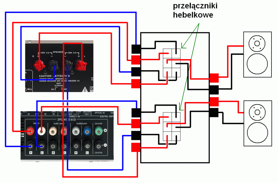 Witam koledzy potrzebuję podłączyć wzmacniacz stereo i amplituner kina domowego tak aby wzmacniacz i amplituner korzystały z pary przednich głośników ,znalazłem selektor stołowy marki Russound ab2.2 ale cena jest nie wąska, może ktoś kombinował już w ten sposób ,nie mam pre out musi to być przez jakiś przełącznik .dzięki za jakieś informacje z góry pozdrawiam