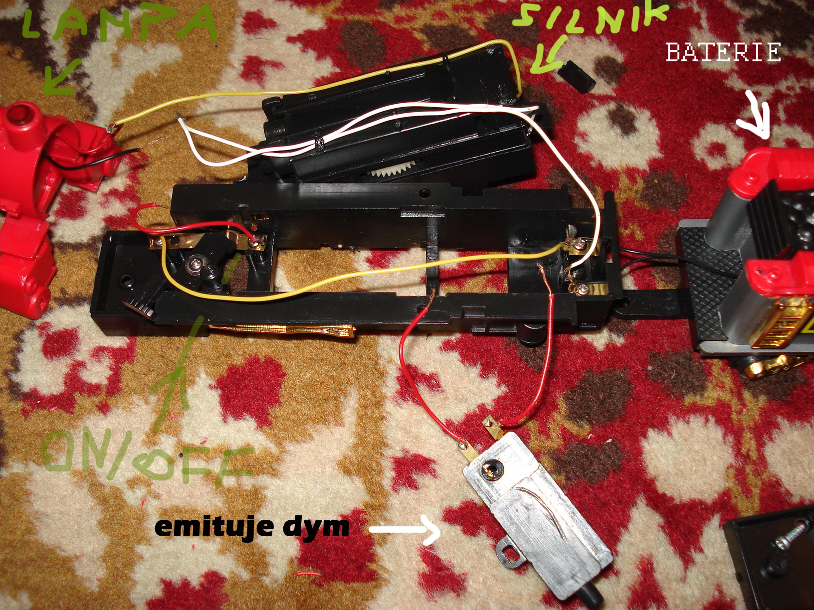 Witam, mam taki problem, otóż chciałem dzisiaj uruchomić kolejkę no i są tam pozrywane kable, chciałbym was zapytać jak je podłączyć. Zdjęcie jako tako opisałem ale nie wiem jak to podłączyć, żeby emitował dym, świeciła lampa silnik działał i tam jeszcze gdzi silnik jest jeszcze gwizdek chyba(coś co dmucha powietrze)