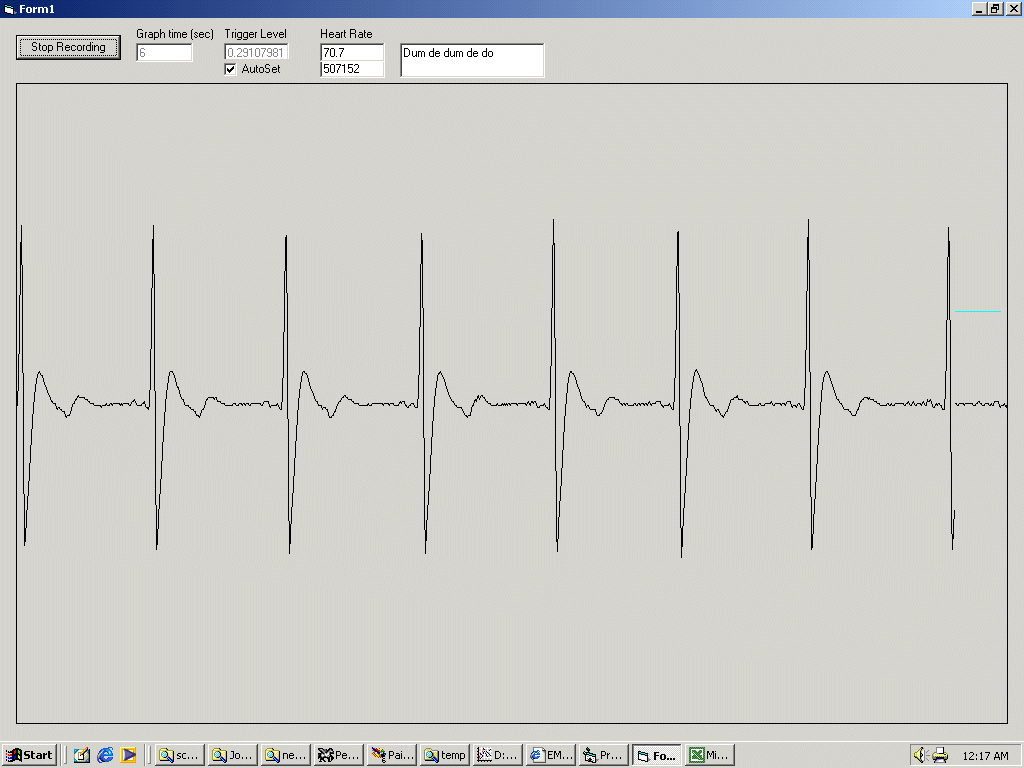 Aby używać tego EKG, elektrody należy posmarować balsamem i przykleić sobie do piersi. Po włączeniu układu na ekranie powinniśmy zobaczyć taki rysunek