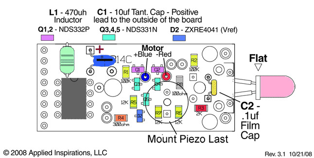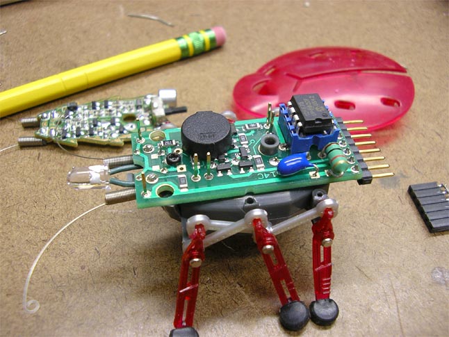 Pierwotnie robot miał wbudowane 3 rodzaje zachowań: do przodu, cofaj z zakręcaniem (przy zderzeniu) i cofaj po głośnym dźwięku. Nowy sterownik zapewnił dodatkowe funkcje: kontrola silników, detekcja przeszkód, wykrywanie poziomu rozładowania baterii i wykrywanie natężenia oświetlenia. Do realizacji tego zadania wykorzystano 8-pinowy mikroprocesor PIC. Cały schemat układu znajduje się tutaj: