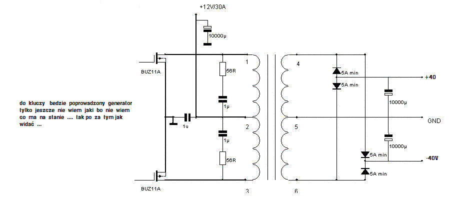 DNBass napisał:niezła porcja teoribede miał nad czym myslec...przedladnia ma byc z akumulatora samochodowego czyli +12V na semetryczne zmienne 28,5 Vprzyjmijmy ze 30 V ma wychodzic z trafka (schetat w załaczniku )... ile bedzie Hz na wyjsciu jak duzo to trza bedzie jakies diody ultra szybki np szotkiego(sory ale nie wiem jak to się pisze)