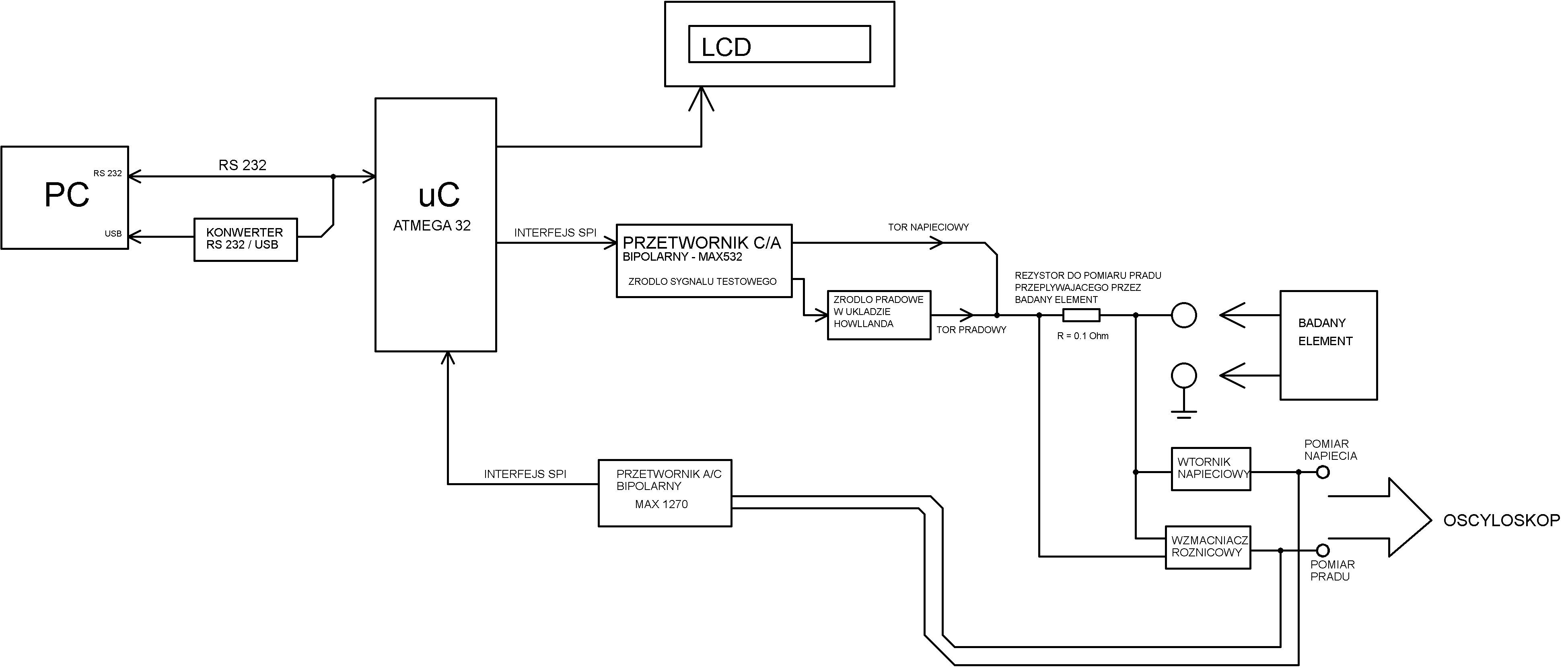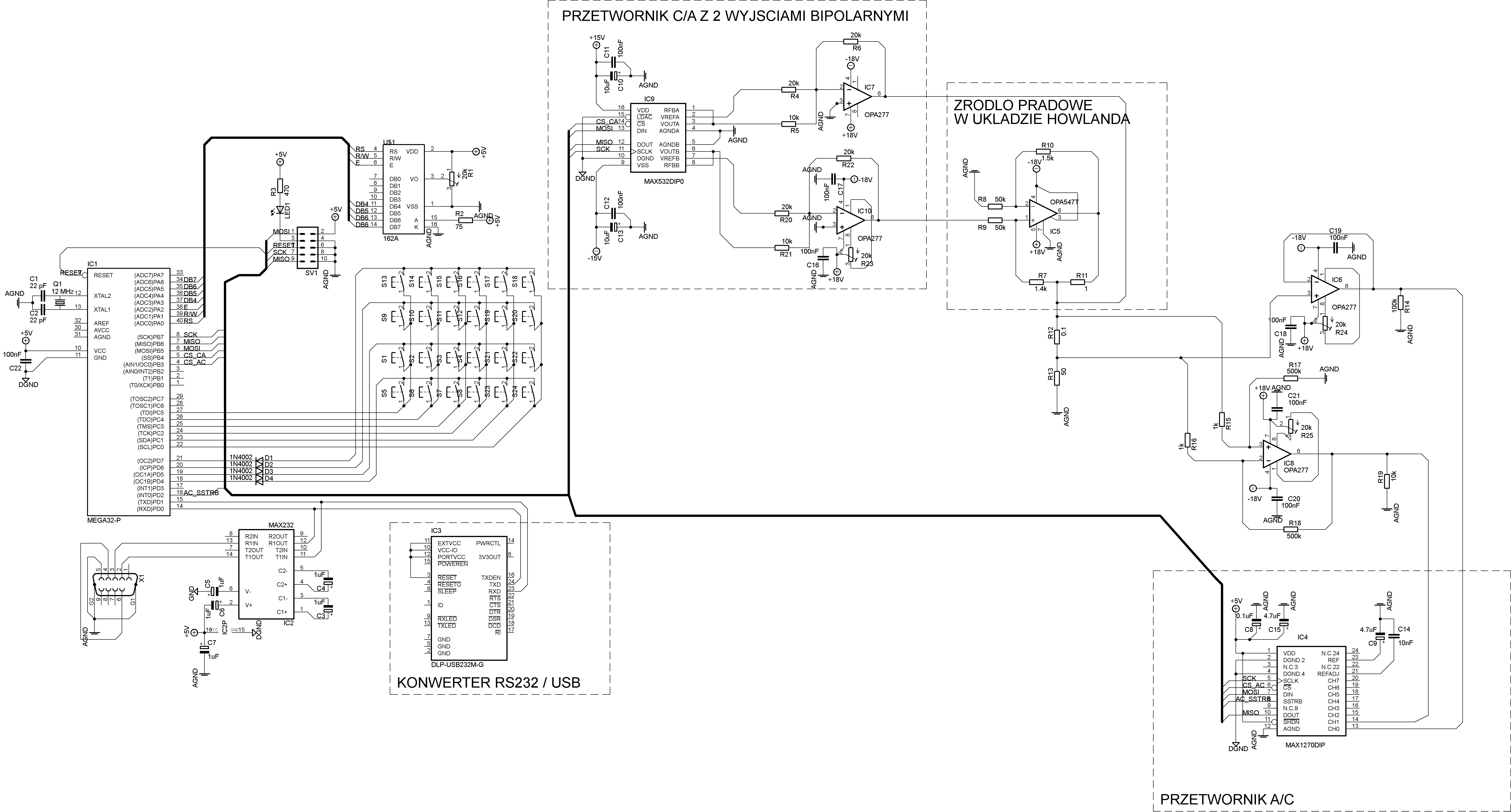 Witam, pragnę pochwalić się swoim skromnym projektem. Jednocześnie chciałbym poznać Wasze komentarze i uwagi co można w nim poprawić. Jest to układ do wyznaczania charakterystyk prądowo - napięciowych dowolnych dwójników, zwany charakterografem. a uzyskane przebiegi ma prezentować zarówno na ekranie oscyloskopu jak i poprzez interfejs RS232 lub USB na komputerze. Poniżej prezentuję schemat blokowy, ideowy jak i schemat zasilania układu.
