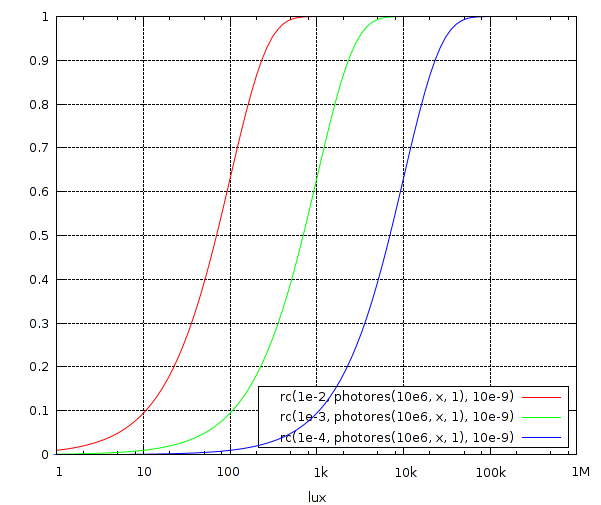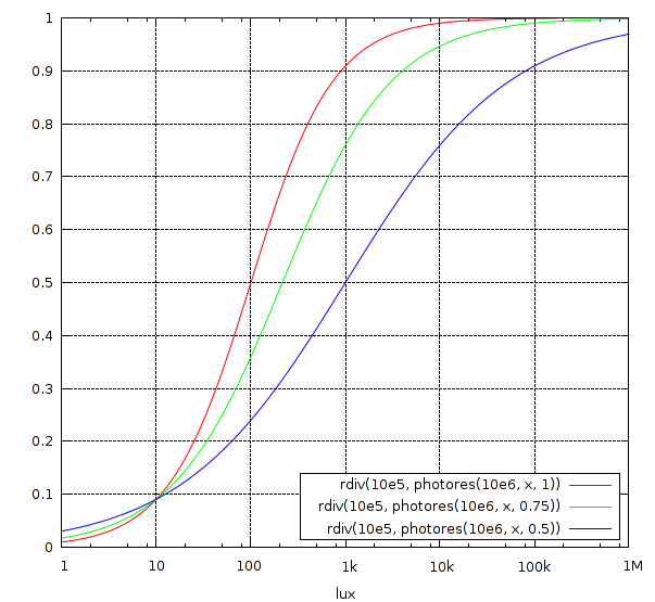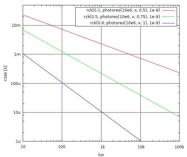 Później czytasz o fotorezystorach, i dowiadujesz się, że $$R = R_{10}\left(\frac{10}{E}\right)^g$$, gdzie $$R_{10}$$ to tzw. rezystancja ciemna (zwykle przy 10 luxach), a $$g$$ to stały współczynnik zależny od materiału światłoczułego, który przyjmuje wartości od 0,5 do 1.