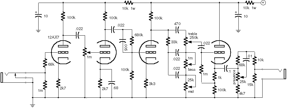 Witam. Mam do zaprezentowania projekt lampowego przedwzmacniacza gitarowego wzorowanego po części na modelu Marshall JCM800. Załączony schemat zawiera tylko obwód przedwzmacniacza, natomiast na płytce PCB przewidziane są także miejsca na elementy zasilacza anod oraz żarzenia. Wszystkie elementy opisane są na schemacie montażowym. Czerwone linie symbolizują zwory. Stabilizator 78S12 w zasilaczu żarzenia wymaga radiatora. W załączniku - projekt PCB do wydruku w dwóch wersjach: z odbiciem lustrzanym i bez. Układ był uruchamiany i działa poprawnie.