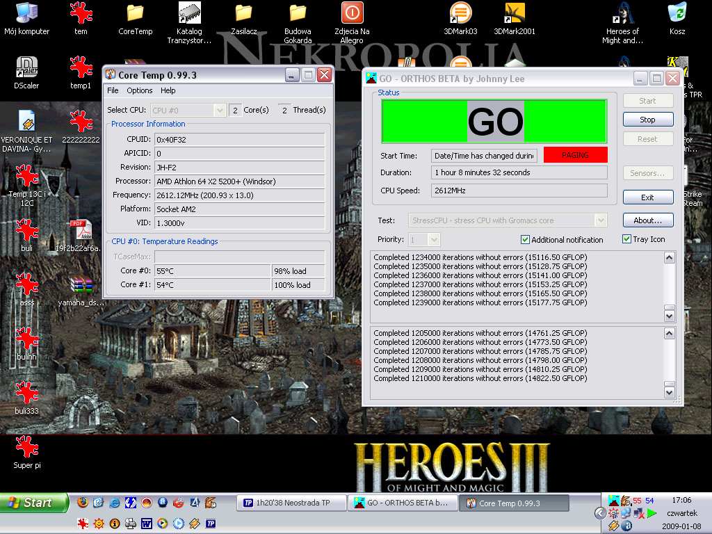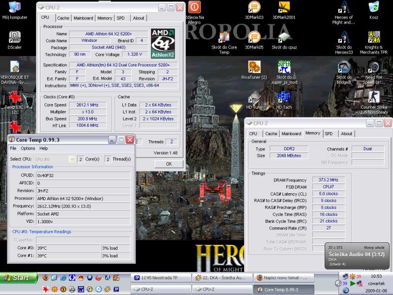 Witam posiadam procesor Athlon 5200x2. Chłodzenie jakie mam to Pentagram NXC-100 AlCu. U mnie temp. przy słuchaniu muzyki i przeglądaniu Internetu wynosi po ok 40C na rdzeń przy minimalnych obrotach wentylatora. Mam pytanie jaka jest temperatura pracy max? w moim przypadku według mnie temp. jest ok. I jeszcze pytanie dlaczego ram mi taktują z prędkością 375MHz?? a nie 400MHz do jest od mnożnika?? tylko przy parzystych liczbach będzie 400MHz? tak mi się wydaje. I jeszcze jakie polecacie chłodzenie do tego procka?? Dodaje fotki.