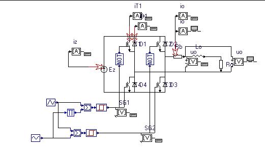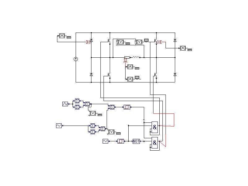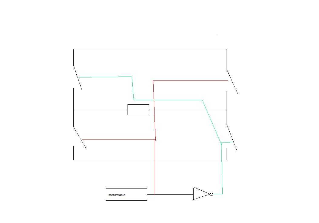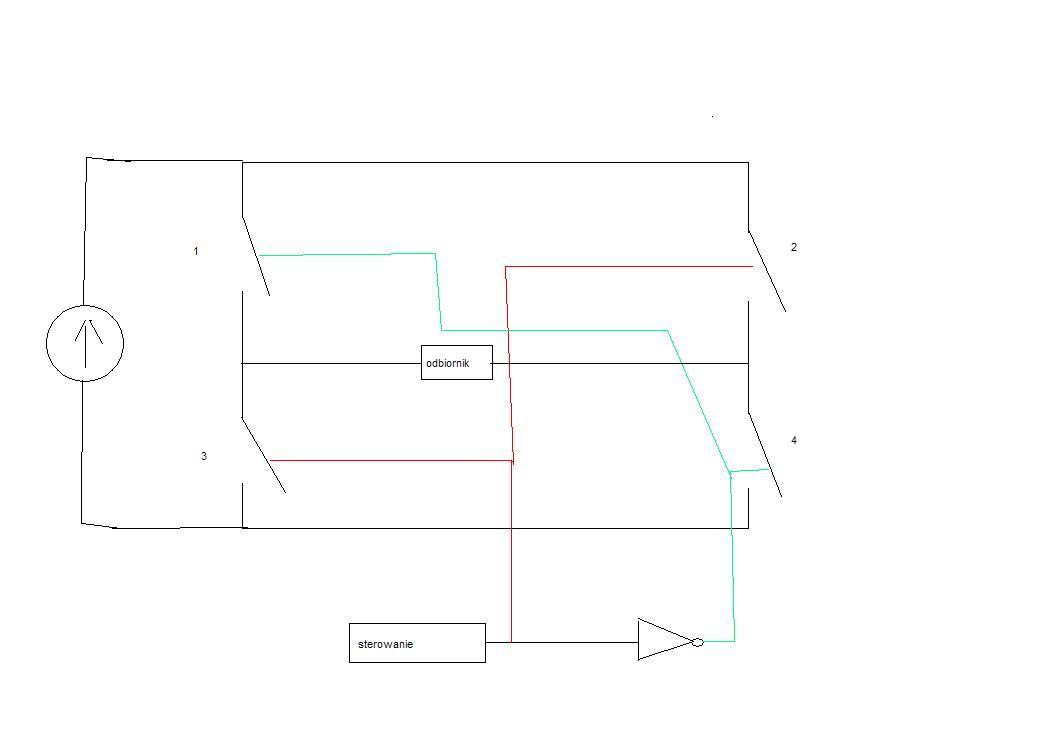 Tranzystory po jednej przekątnej muszą być sterowane z jednego punktu, a tranzystory na drugiej przekątnej muszą być blokowane, czyli sterowane przez bramkę NOT. Oczywiście sterowanie się zmienia i w jednym okresie otwarte są tranzystory 1 oraz 4(2 oraz 3 są blokowane), a drugim okresie jest odwrotnie.