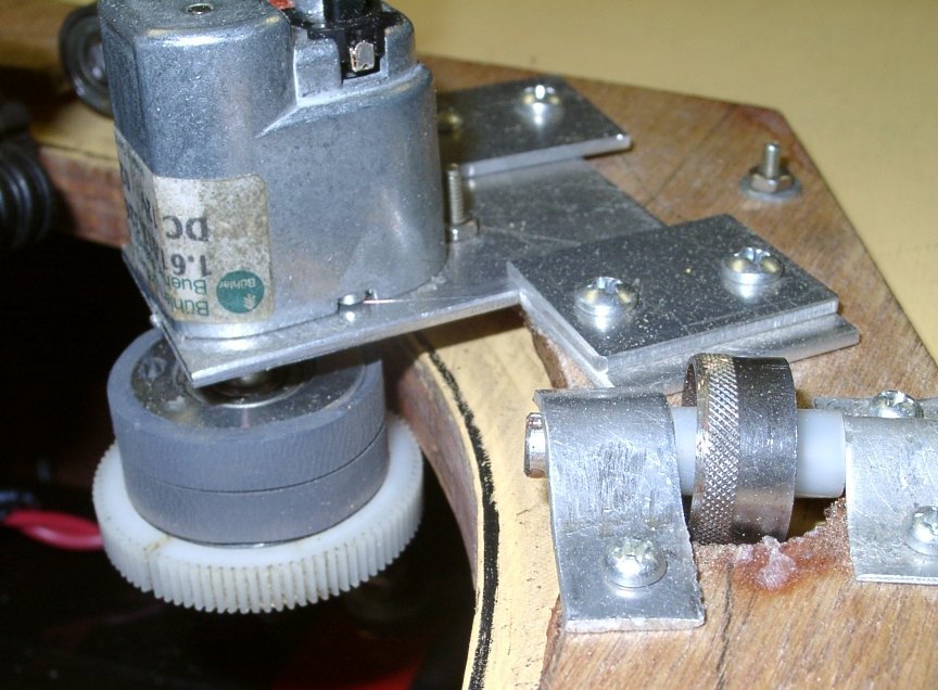 Silnik z przekładnią i przymocowana na końcu wału zębatka obraca wieżę (zębatka i wewnętrzna krawędź dolnego otworu wieży tworzą coś na kształt przekładni ciernej)