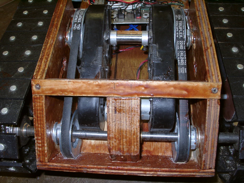 Do sterowania kierunkiem obrotów silników wybrano przekaźniki. Napięcie łańcucha w gąsienicach można regulować (bardzo dobrze przemyślane rozwiązanie).