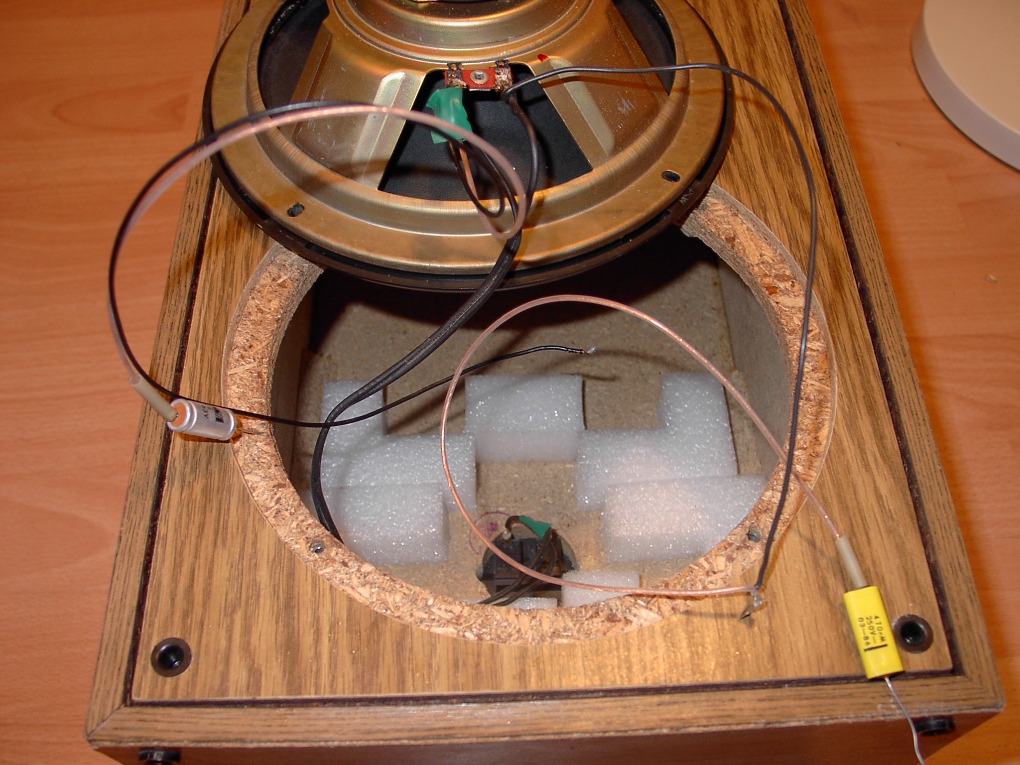 - z minusa wychodzą 2 kable. Na końcu jednego z kabli (był podłączony do średnich tonów) kondensator(?) o oznaczeniu BPE 1uF 63v. Drugi kabel jest normalny (czarny) podłączony do wysokich