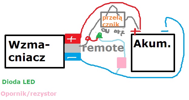 podłączony od dłuższego czasu jest w/w wzmacniacz. Obwód podtrzymujący (RMT) składa się z 12V z radia, przechodzi przez przełącznik dźwigienkowy i wchodzi do wzmacniacza.