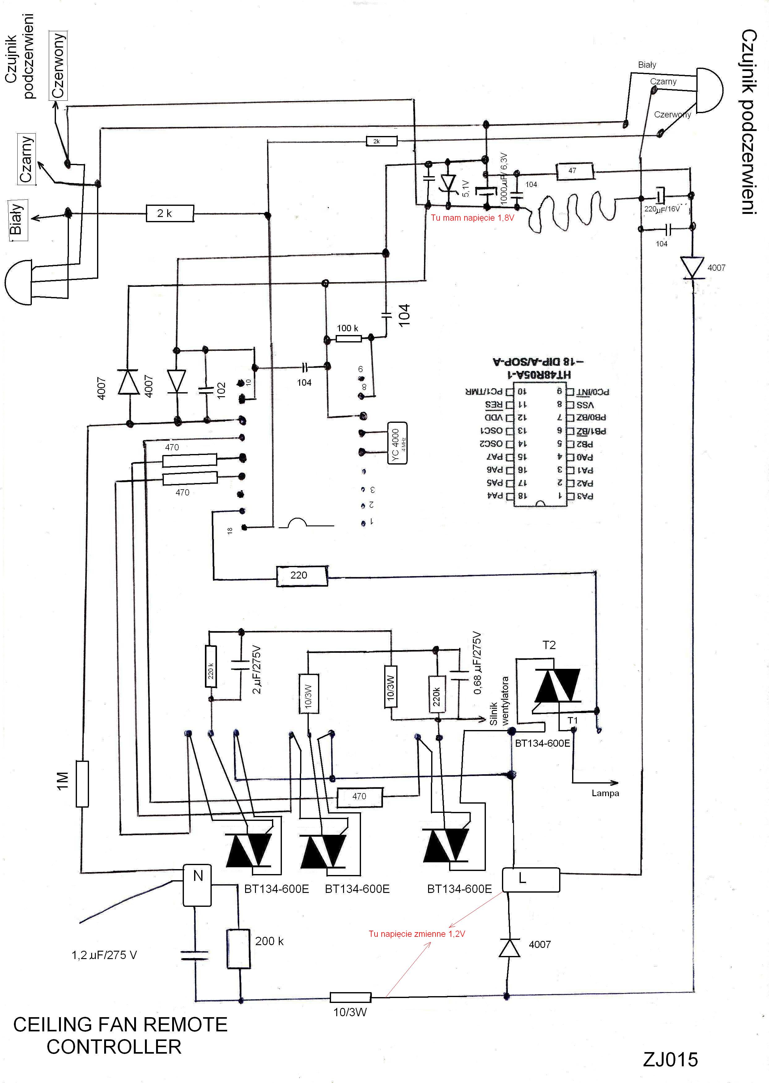 Witam, kupiłem taki nietypowy wentylator sterowany z pilota i tu problem wysiadło sterowanie ( ceiling fan remote controller Model: ZJ015 ) Sprawdzałem i podstawiałem kondensatory ( oprócz tych wysokonapięciowych ), wylutowałem scalaka i dalej mam chyba za małe napięcie na elku 100µF/6,3 V , nie można załączyć wentylatora, ani lampy. Czy takie napięcie wystarczy żeby sterowanie działało? Rozrysowałem schemat. Proszę o pomoc.