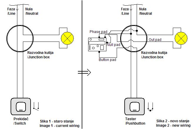 Ściemniacz podłącza się do istniejącej instalacji w puszce, która przeważnie znajduje się nad włącznikiem na ścianie. Urządzenie należy podłączyć zgodnie z załączonym schematem, ponieważ niewłaściwy montaż może skutkować dziwnym zachowaniem układu lub nawet pożarem.