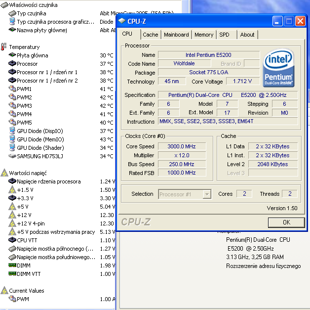 E2500 2500 O/C 3000Mhz ,przy 3500Mhz Win nie odpala, ale do biosu wchodzil na 1.25 V.