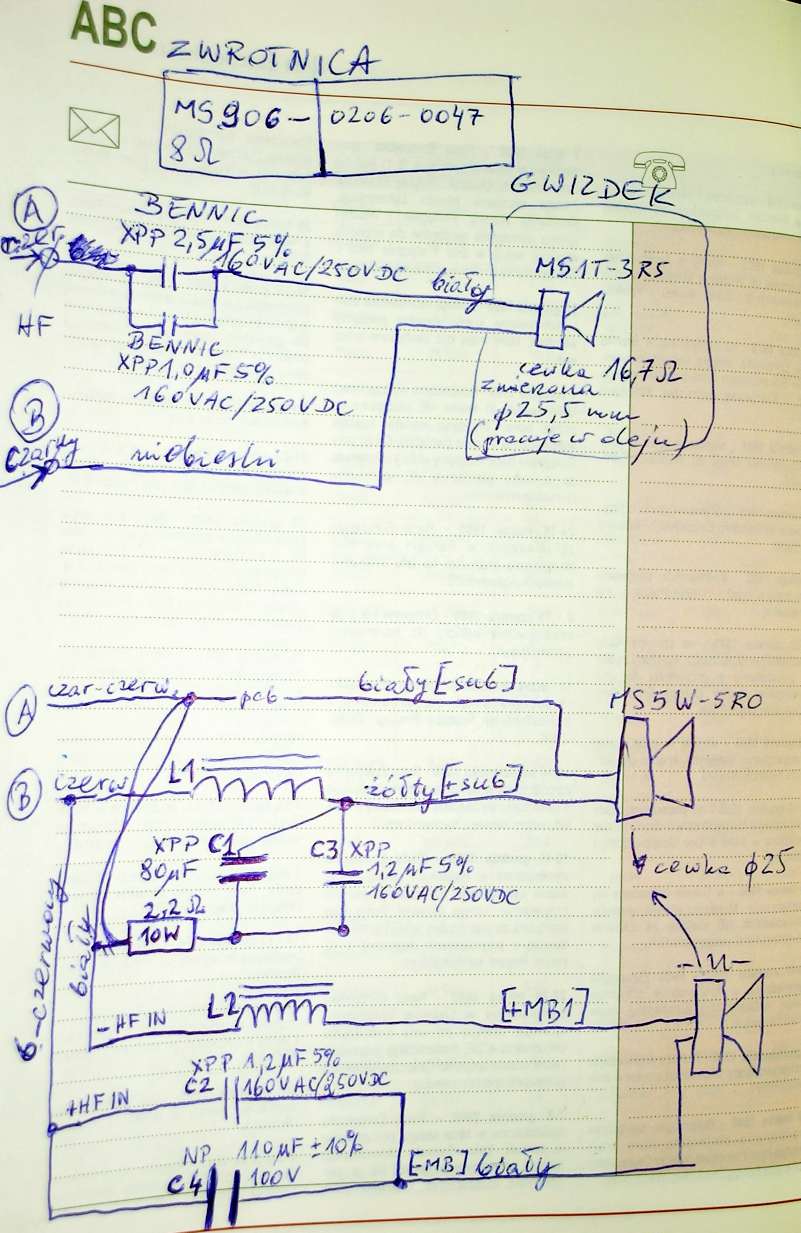 Załączam schemat zwrotnicy i zdjęcia uszkodzonych elementów... Biorę pod uwagę własnoręczną naprawę głośników przez wymianę cewek. Tylko nie wiem jakie zamówić (znam tylko średnicę cewek: 25 mm). Interesują mnie dwie sprawy: