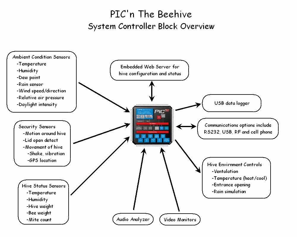 Amerykański konstruktor/naukowiec postanowił zbudować system służący do monitoringu uli, a także do prowadzenia eksperymentów na pszczołach. Aby tego dokonać, potrzebny jest pomiar wielu parametrów. Na zewnątrz mierzone śą temperatura, wilgotność, deszcz, prędkość i kierunek wiatru, ciśnienie powietrza oraz nasłonecznienie. Wewnątrz ula zapewniona jest regulacja temperatury oraz wentylacja. Możliwość symulacji deszczu pozwala na sztuczne przytrzymanie pszczół w ulu. Specjalne komory wejściowe do środka służą do zliczania ilości pszczół oraz do określenia wagi każdej z nich. Cały ul znajduje się na wadze, co pomaga w określeniu aktualnej ilości miodu. Autor również pomyślał o bezpieczeństwie. Stały nadzór kamery, odbiornik GPS oraz telefon komórkowy pomaga w określeniu pozycji ula w przypadku kradzieży. Sercem projektu jest PIC32, który to zbiera oraz przetwarza pobrane dane. Całość monitorowana oraz zarządzana jest przez wbudowany serwer WWW. Specyficzne warunki pracy układów zmusiły autora do nowatorkiego podejścia do niektórych problemów, o których możemy poczytać na stronie źródłowej na której dostępne są również schematy oraz filmy wideo z prezentacją.